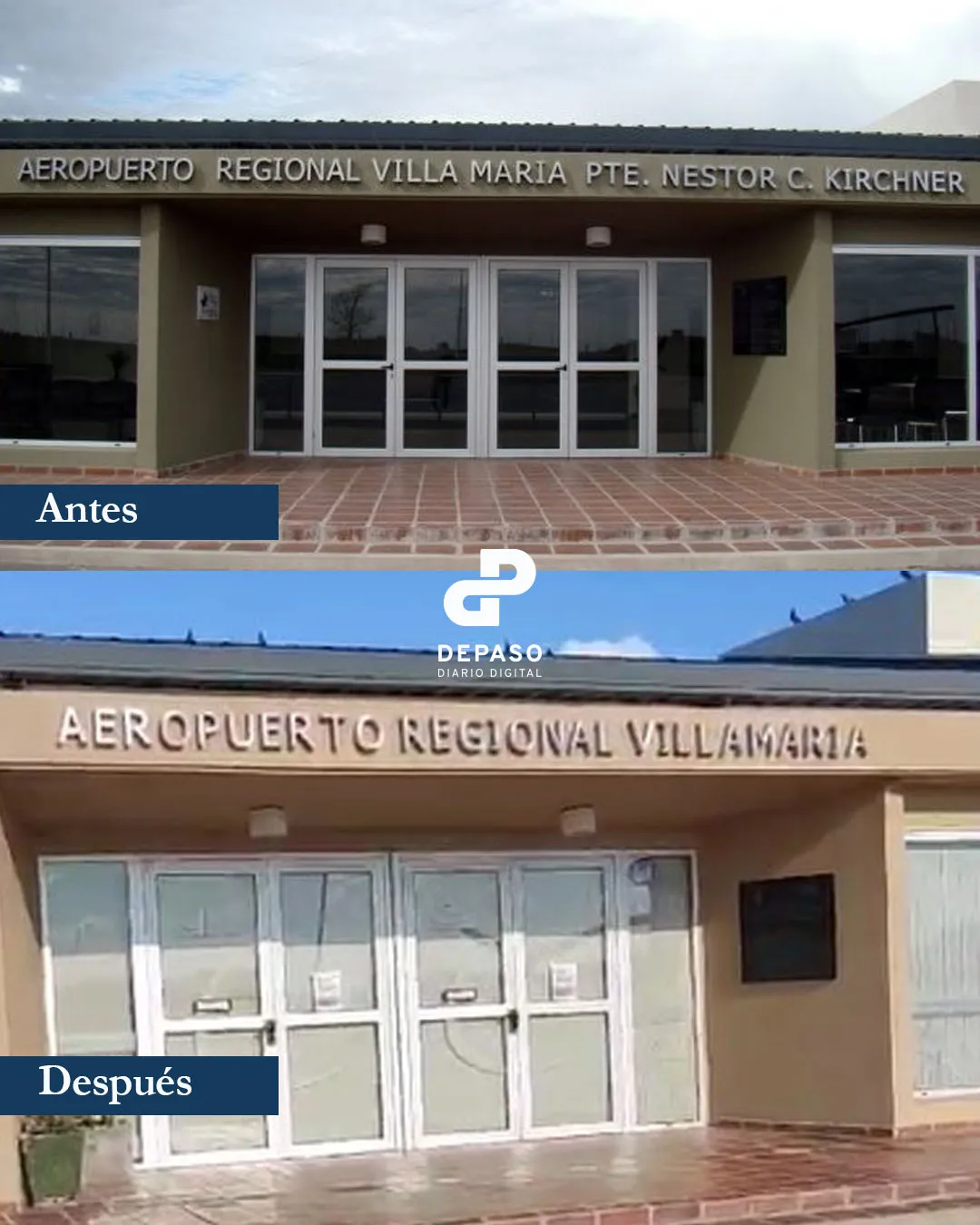 Hay otra fotografía: es del viernes 8 de noviembre de 2024 y está en el feed de Instagram del perfil «Aeropuerto Regional Villa María». En la fotografía se ve la pared del edificio frente a la pista, donde debería estar el nombre —la dimensión material del nombre— está el espacio desocupado, vacío, vacuo, vacante. Está disponible.